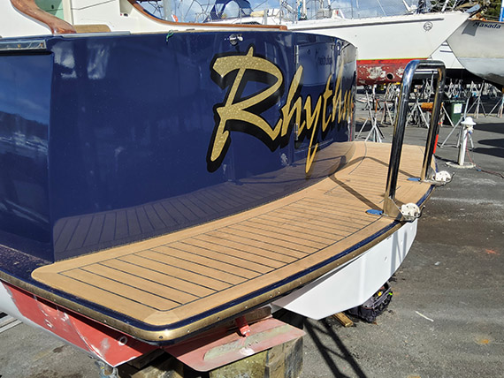 My wife Janet and I had wanted for an extended swim platform on our 40’ launch for some time. We feel fortunate to have connected with Graeme at Opua Boatbuilders for the job. Graeme and his team were very patient with us as they walked us though some possibilities. We ended up with a nice simple duckboard with a bait station, BBQ stand and a nice hidden ladder for reboarding from the water. Also included was nice flip away seat on the stern for Janet to fish from.